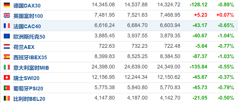 欧洲主要股指普遍走弱,截至发稿,德国DAX30指数跌0.89%,英国富时100涨0.07%,法国CAC40跌0.65%。来源:英为财情Investing.com