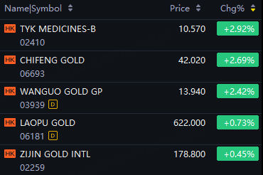 Gold stocks rose in Hong Kong trading. Chifeng Gold up 3%; Wanguo Gold up 2%; Laopu Gold up 1%; Zijin Gold Intl up 0.5%.