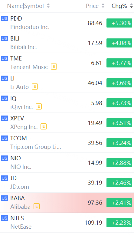 Pinduoduo rose over 5%; Bilibili rose 4%; iQiyi, XPeng, Li Auto rose over 3%; Alibaba, JD.com, Nio rose over 2%.