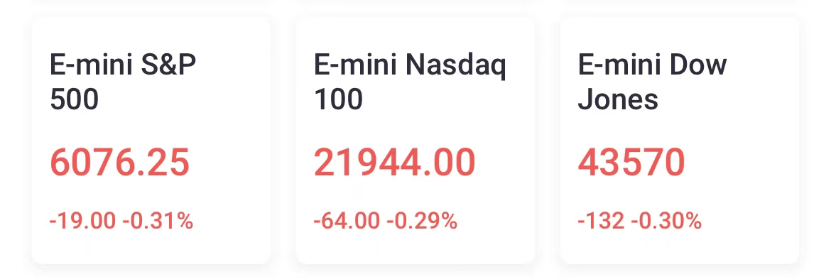 At 8:50 a.m. ET, Dow e-minis were down 132 points, or 0.30%, S&P 500 E-minis were down 19 points, or 0.31%, and Nasdaq 100 E-minis were down 64 points, or 0.29%.