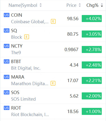 Coinbase rose 4%; Block rose 3%; The9, Bit Digital, Marathon Digital rose over 2%.