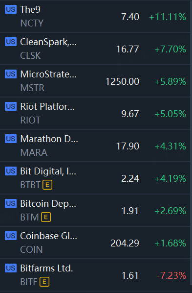 The9 rose 11%; CleanSpark rose 8%; MicroStrategy rose 6%; Riot Platforms rose 5%; Marathon Digital rose 4%; Coinbase rose 2%. While Bitfarms dropped over 7% as it booted CEO, effective immediately, rescheduled earnings.