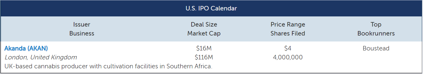 After narrowing its range this past week, British cannabis firm Akanda (AKAN) plans to raise $16 million at a $116 million market cap. The company plans to supply medicinal-grade cannabis biomass, cannabis flower, and cannabis concentrates to wholesalers in international markets, with cultivation facilities in Southern Africa. Akanda’s operations are still early stage, and it has generated minimal revenue to date.