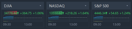 U.S. Stock Jumped Over 1% in Morning Trading. Nasdaq gained 1.64% while Dow Jones and S&P500 gained 1.06%,1.24% separately.