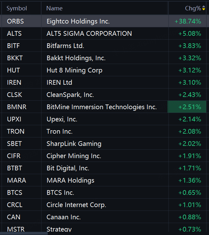 Crypto stocks gained in premarket trading. Eightco Holdings rose 39%; Bitfarms rose 4%; IREN and BitMine rose 3%; SharpLink Gaming and Cipher Mining rose 2%; Circle rose 1%; Strategy rose 0.7%.