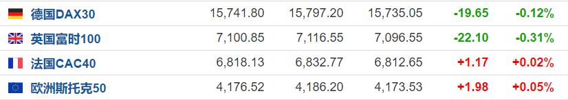 欧洲主要指数涨跌互现,截至发稿,德国DAX30跌0.12%,英国富时100跌0.31%,法国CAC40涨0.02%,欧洲斯托克50涨0.05%。