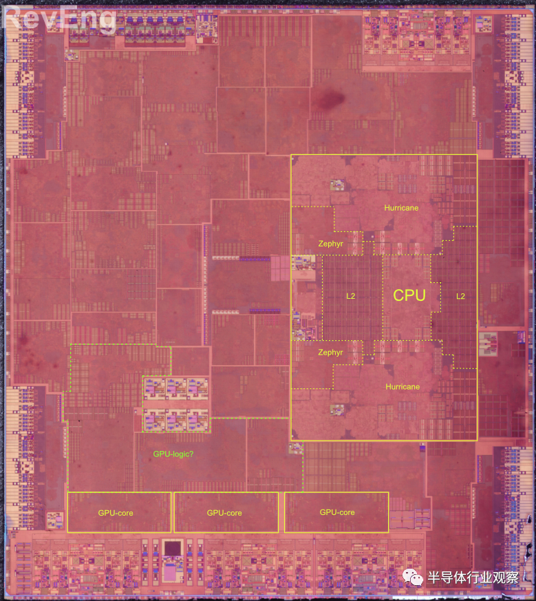 从视觉上看,CPU 是第一个跳出来的东西。它的设计和布局与 A10 相同。假设 T2 是在 A10 之后设计的,那么 CPU 就作为一个硬宏(hard macro)被丢弃了。记住它是一个 4 核 CPU!有两个性能,即大型Hurricane内核和两个效率(即小型 Zephyr )内核。