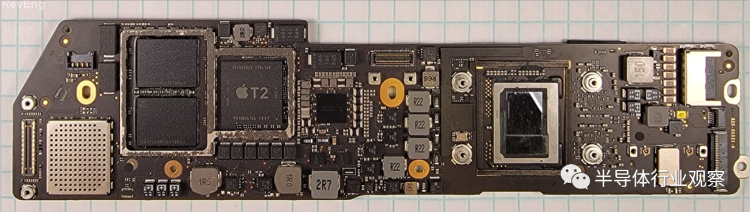 正在研究的 T2 来自 2019 年的 13 英寸 MacBook Air 逻辑板。与周围的其他 IC 相比,T2 的封装具有不错的占用空间。相比之下,T2 右侧四个安装座之间较大的闪亮芯片是英特尔 i5。根据包装,可以设想 T2 具有类似的尺寸。包装上有一个“1847”日期代码,表示 2018 年末组装。
