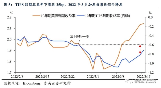 我们预计美联储更快的加息步伐将拉动美国10年期TIPS到期收益率走高。3月以来,美联储各票委对本次加息幅度发表了较多观点,更多表达的是对加息25bp的支持。加息50bp预期落空后美债实际收益率出现下滑,TIPS到期收益率自3月初开始下行。近一周平均值较2月末下行近25bp,实际效果近似于降息。但在年内加息节奏加快的预期下,我们预计10年期TIPS到期收益率将重拾上行趋势。