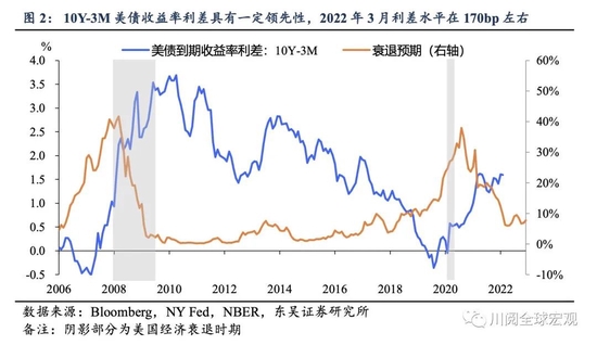 2022年3月市场利率表明美国经济衰退概率将在2023年明显上升,但仍难以阻碍加息步伐。10Y-3M 美债收益率利差具有一定领先性,曲线倒挂则预示着经济陷入 衰退的可能性升高。目前该利差约为170bp,暗示美国经济衰退风险将在加息6次后明显上升。然而,结合鲍威尔讲话和美联储对通胀的预测,为防止通胀上涨过快而影响消费者信心,美联储将持续加息直至通胀回到目标区间。