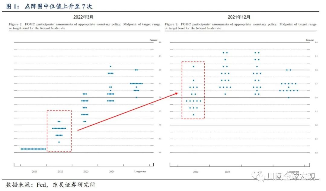 第四,点阵图显示加息中位值达7次,超出市场预期。通胀问题是美联储亟待解决的首要问题,其重要程度甚至超过了经济增长下行压力和劳动参与率的不足。本次会议的点阵图所显示的加息预期较此前更为激进,75%的官员预计今年将加息7次,此前市场普遍预计中位数为5次。同时,近7成票委支持明年加息3次或以上。会议结束后,年内市场隐含加息7-8次的预期上升10个百分点至66%。