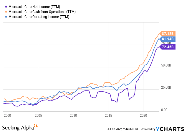 Microsoft has grown the combination of its income and operating cash flow at 9.5% per annum since 2000. The company has had periods of both rapid growth, like the past 5 years, as well stagnant growth. What caused the rapid growth over the past 5 years was cloud, but much like PC's in the late 90's, this growth can stall out. It is exceptionally difficult for large companies to grow faster than 10% per annum over an extended period.