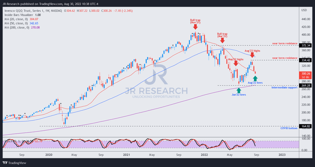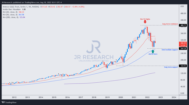 The QQQ has recovered remarkably from its June lows, surging more than 24% toward its August highs before the recent deep pullback post-Jackson Hole. Therefore, some bearish investors have suggested that the "bear market rally" has run its course. As a result, the market would wake up to the realities of the recessionary themes, and a still hawkish Fed, putting further downward pressure on the tech-heavy QQQ.