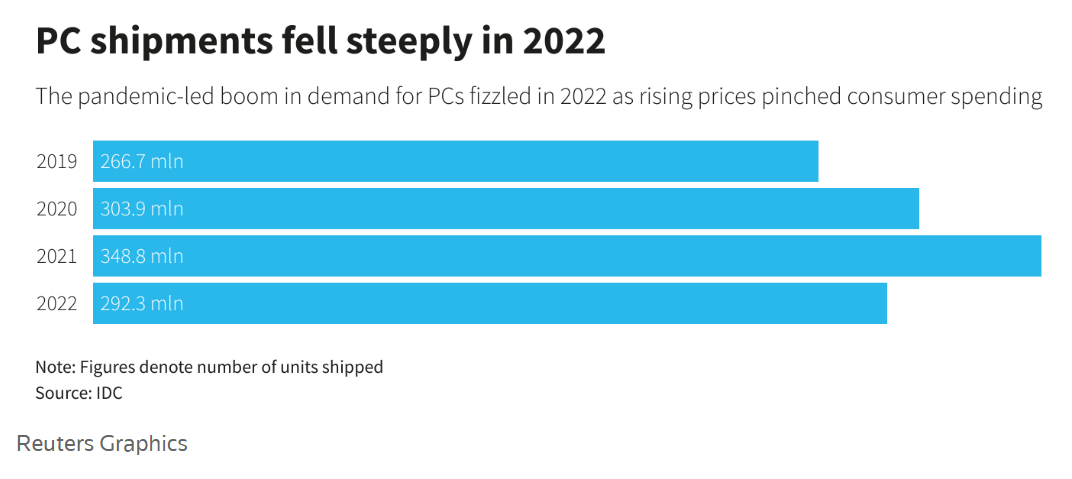 PC shipments fell 16.5% to 292.3 million units in 2022, per data from research firm IDC, forcing chipmakers to cut back production and slash revenue forecasts.