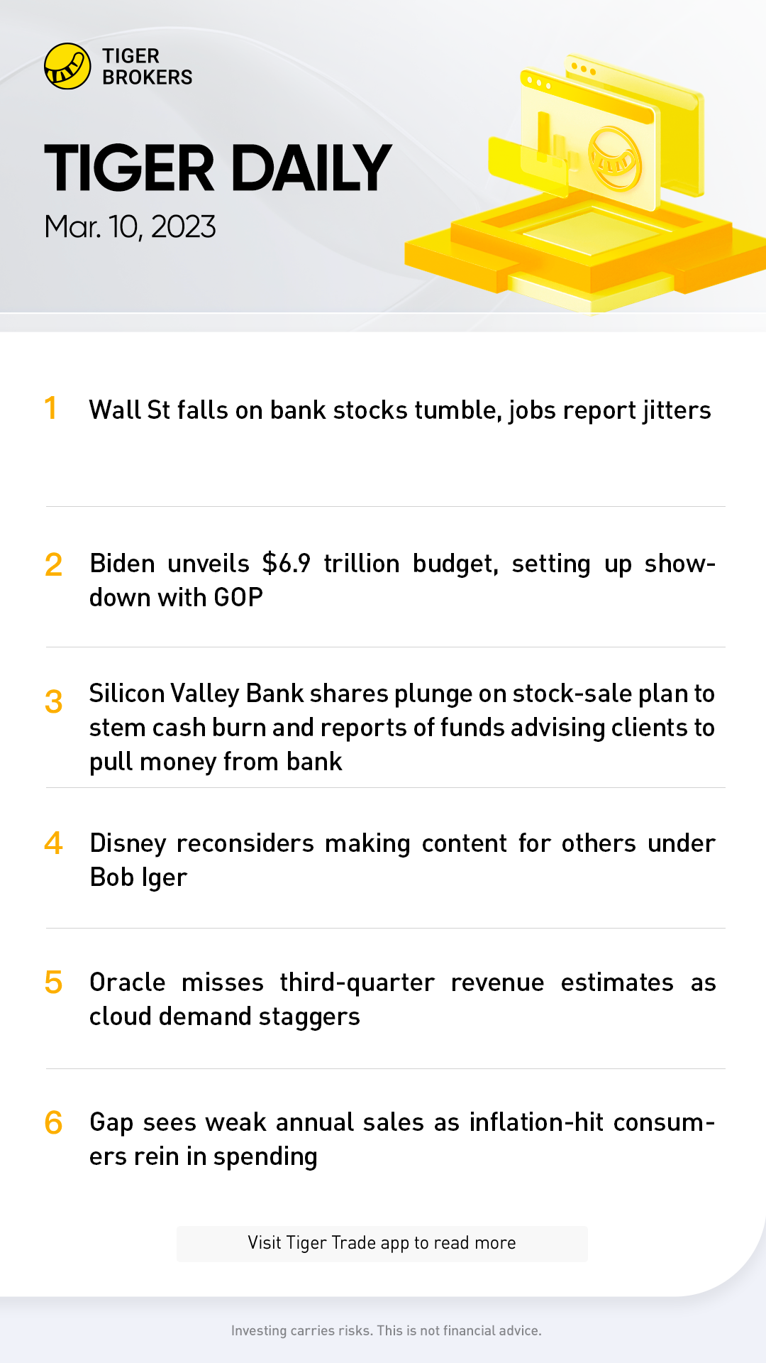 The S&P 500's bank index finished down 6.6% after hitting its lowest level since mid-October. Investors fled the sector after tech-industry lender SVB Financial Group launched a share sale to shore up its balance sheet due to declining deposits from startups struggling for funding.