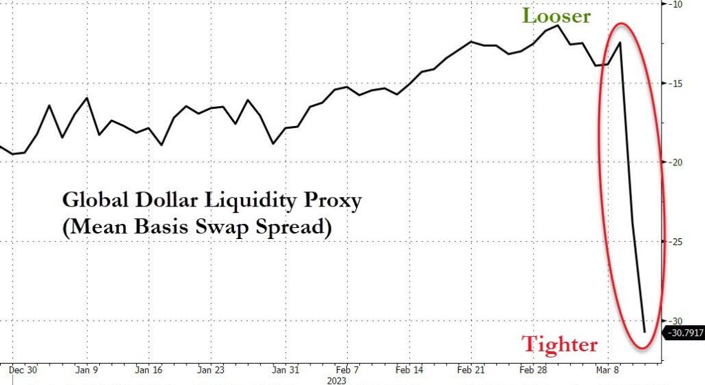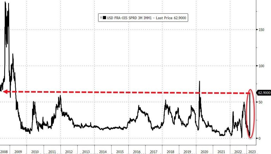 其中之一是FRA-OIS利差。它升至除新冠疫情期间以外的雷曼兄弟危机前最高水平,凸显了系统性银行的信用风险急剧上升。