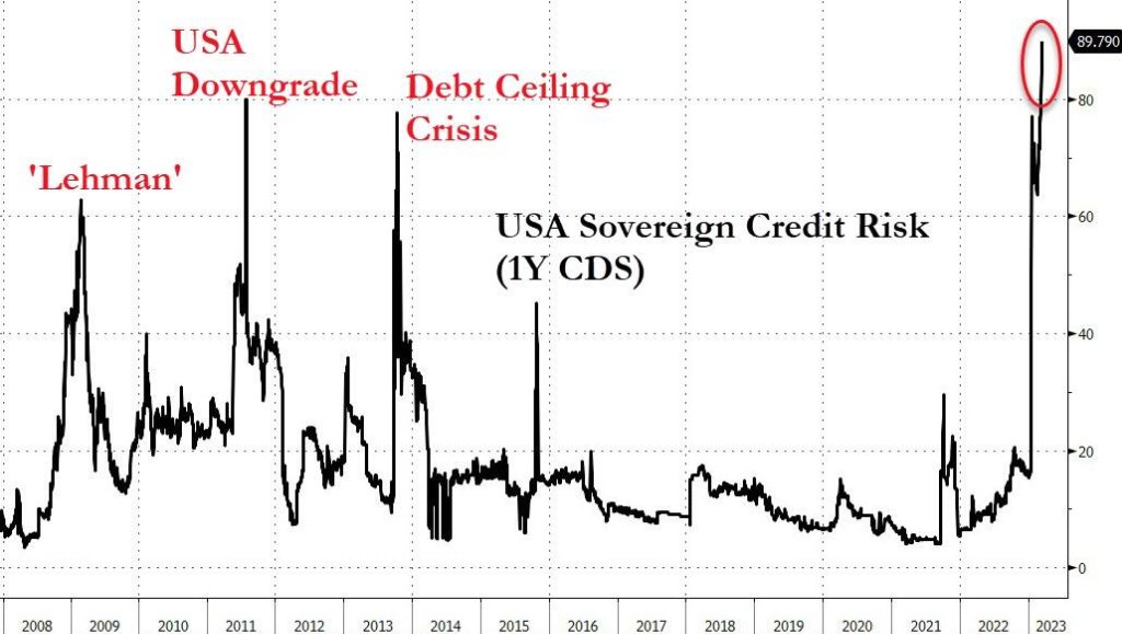 拜登和耶伦都说银行系统有韧性,可三大指标都亮红灯。其中,基于一年期CDS的美国主权信用风险、也可称为美元贬值风险超过了2011年美国主权信用评级被标普降级时的水平。
