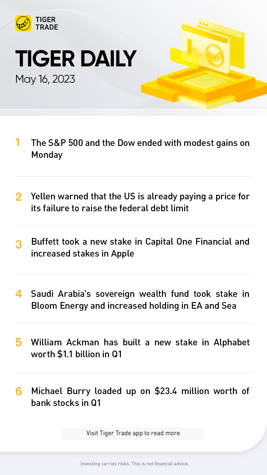 The S&P 500 and the Dow ended with modest gains on Monday after manufacturing data raised concerns about a slowing U.S. economy that could help bring down inflation amid ongoing debt ceiling negotiations, while a rise in Meta shares helped lift the Nasdaq.