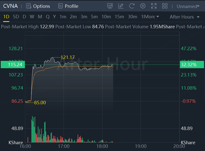May 1 (Reuters) - Shares of Carvana surged 32.3% in extended trading on Wednesday after the used-car seller forecast a surprise rise in current-quarter retail sales and core profit.