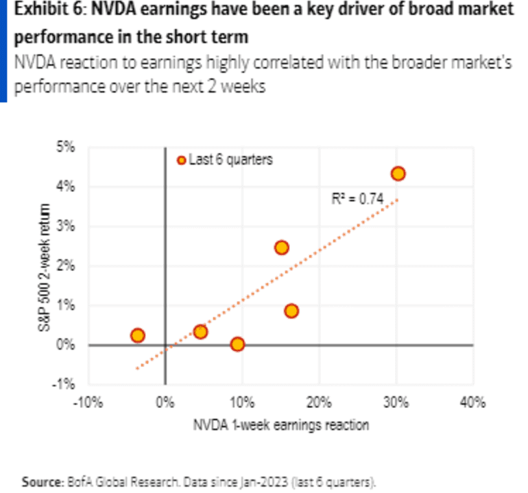 The quarterly earnings results for Nvidia $(NVDA)$, the poster child of the artificial-intelligence theme, have been a key driver of short-term stock-market performance since January 2023, Asis and his team said. The chart below shows that the reaction of Nvidia's stock to earnings is highly correlated with the S&P 500's SPX performance in the two weeks following the release.