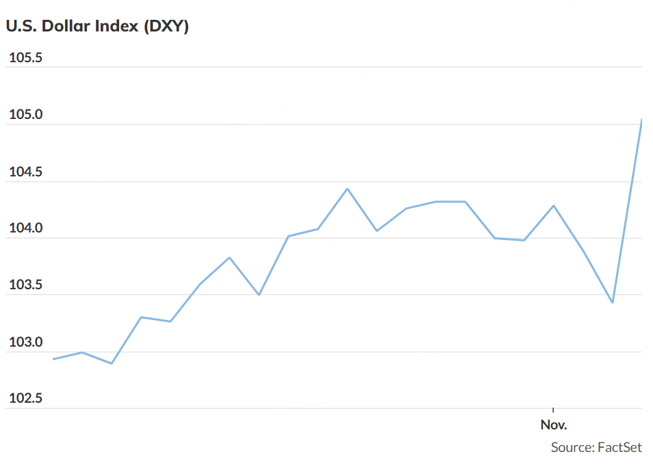 Soaring Treasury yields alongside the prospects of punishing tariffs against trade partners have served to boost the U.S. dollar. The ICE U.S. Dollar Index, a measure of the currency against a basket of six major rivals, was up 1.7% after trading at its highest since early July.