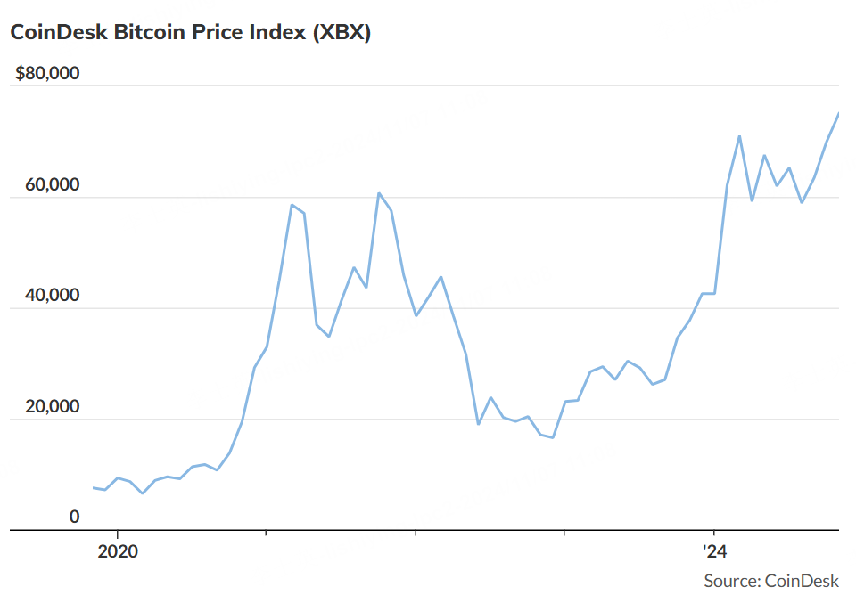 Bitcoin had surged 9.5% Wednesday at last check, trading in record territory above $76,000.
