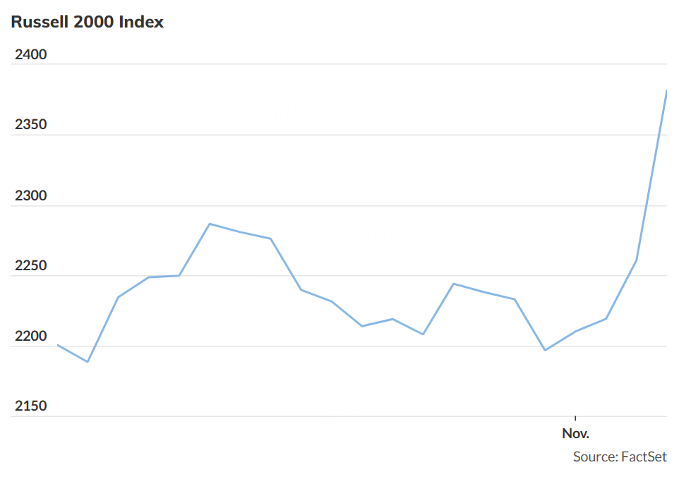 Small-cap stocks were the big winners, with the Russell 2000 (RUT) up 5.8% and more domestic-oriented companies expected to benefit from stronger U.S. growth relative to the rest of the world, as well as lower taxes.