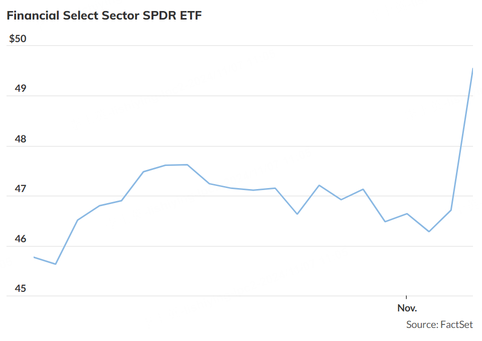 The prospect of lighter regulation saw bank stocks soar. The Financial Select Sector SPDR ETF (XLF) jumped 6.2% to lead sector-tracking ETFs. Banks have been pushing all year to loosen capital requirements. They are also expected to benefit from potential tax cuts.