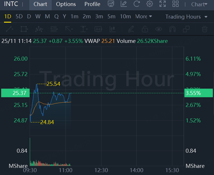 Shares of Intel rose 3.55% in midday trading.