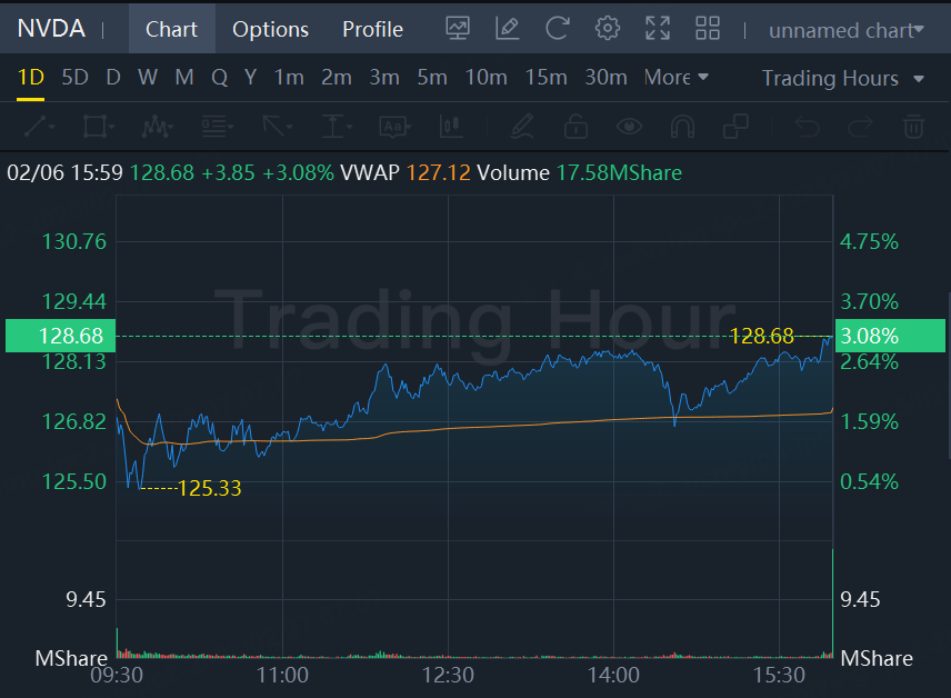 Shares of the chip maker closed 3.1% at $128.68. The S&P 500 increased 0.4%.