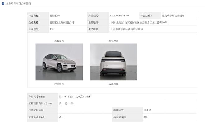 根据此前工信部信息,特斯拉6座版Model Y长宽高分别为4976/1920/1668毫米,轴距为3040毫米。