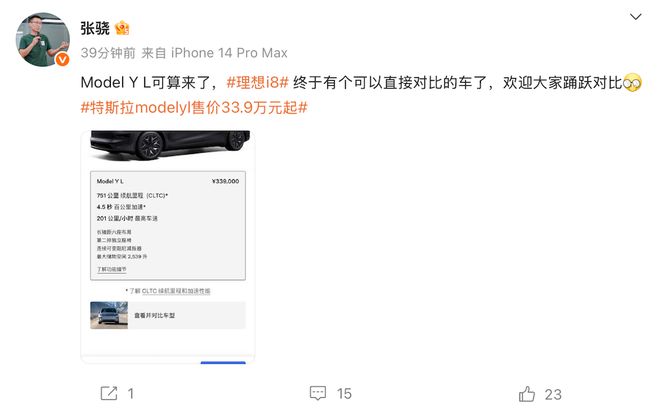 而在新车上架没多久,理想汽车产品线负责人张骁发微博表示:“Model Y L可算来了,理想i8终于有个可以直接对比的车了,欢迎大家踊跃对比。”