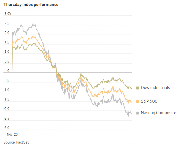 And declines in everything from industrial firms to bitcoin suggested a broad retreat from risk. At 4 p.m., the largest cryptocurrency was at $86,337, down more than 30% from a peak above $126,000 set on Oct. 6.