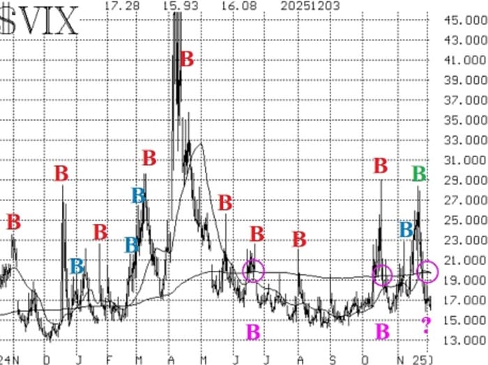 Implied volatility (VIX) VIX has fallen, and so the VIX "spike peak" buy signal of Nov. 21 remains in place. At the moment, there is not a "trend of VIX" signal working, although one may be forthcoming soon. If both VIX and its 20-day moving average are below the 200-day moving average, this would signal the beginning of a new "trend of VIX" buy signal. The lower right-hand area of the accompanying VIX chart shows these two moving averages at basically identical values, while VIX is below the 200-day.