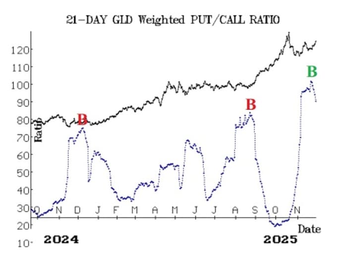 A new weighted put-call ratio has been issued for SPDR Gold Shares ETF GLD. We were invested in this recently and made a decent profit. GLD really didn't pull back all that much during its October-November correction, but put-buying exploded. It seems that the crowd couldn't wait to get bearish on gold. Now gold is rallying again and a new buy signal is in place.