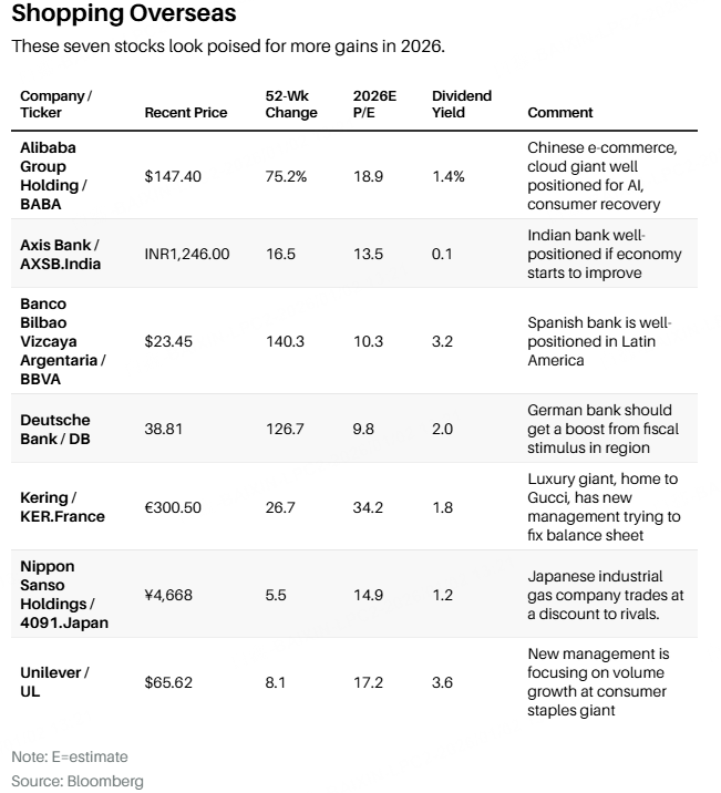 Emerging market stocks still trade at a steep discount to the S&P 500, despite a preponderance of technology stocks in these markets. Within China, investors see opportunity in early adopters of AI. "China is a super-app country; it is harnessing [AI] in media, e-commerce, gaming, and travel," says Kandhari, who says semiconductor and semi-equipment companies, robotics, biotech, healthcare, and consumer-oriented digital platforms are among the beneficiaries. Brandes' Sauberbronn likes the outlook for Alibaba Group Holding, even after the stock's 75% rally in 2025, noting that near-term earnings are depressed because of the company's use of large subsidies to spur growth in its core e-commerce business. But the initiative is showing early signs of success. Alibaba also benefits from its strong position in AI with a "full stack model" that provides compute power, a cloud platform, AI models, and applications, he says.