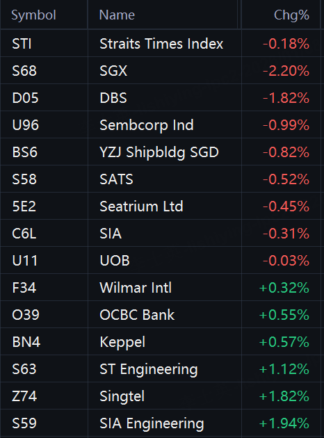The Straits Times Index (STI), a key benchmark for the Singapore Exchange, ranged between 4,726.18 and 4,763.04 throughout the day. It ended the session at 4,739.07, down 8.55 points or 0.2% compared to Wednesday's close.