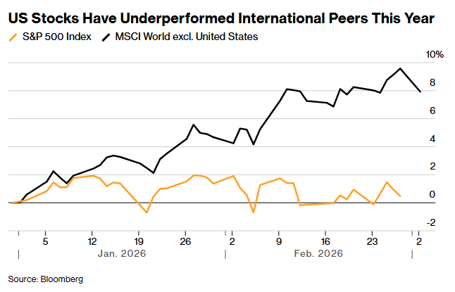 今年对标普500指数而言开局已颇具挑战,美股相较国际市场表现失色,原因包括对人工智能(AI)颠覆风险的担忧以及特朗普政府政策影响等因素。