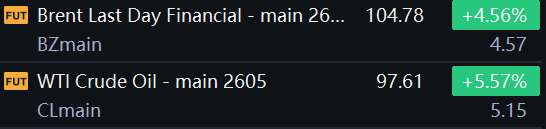 U.S. Crude futures rise more than 5% to $97.61/bbl as supply concerns remain; Brent rose 4.6%