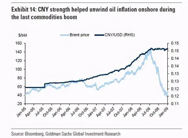 儘管高盛經濟學家預計人民幣即將升值,但上行空間受到中國保持出口競爭力的需要的限制——出口競爭力是中國重商主義經濟的關鍵驅動力。此外,由於人民幣佔美元貿易加權貨幣籃子的比重約爲15%,人民幣的任何升值都會重新點燃美元——大宗商品的通貨再膨脹週期。