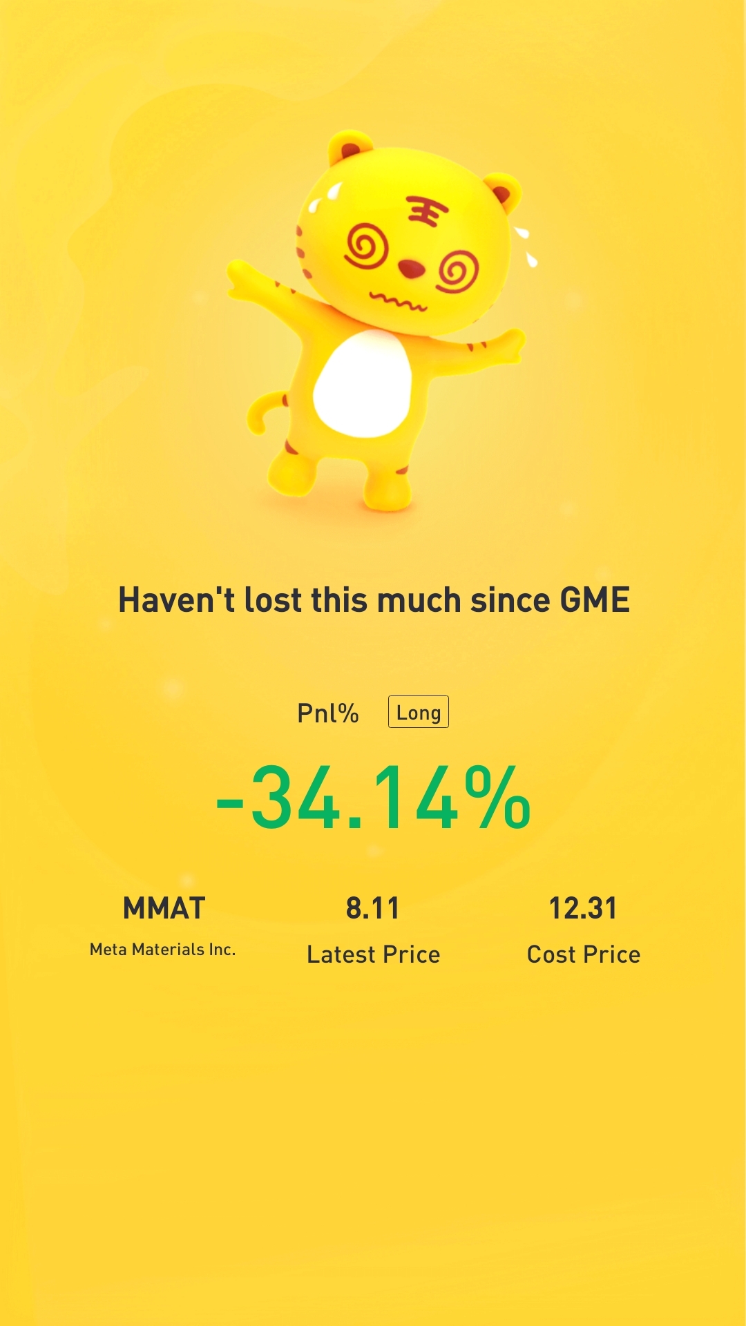 $Meta Materials Inc.(MMAT)$lol. I held when I bought at 11 and it crashed to 4+ on TRCH. Relax guys. Don't panic sell and shoot yourself in the foot. Long hold will profit the company and us.