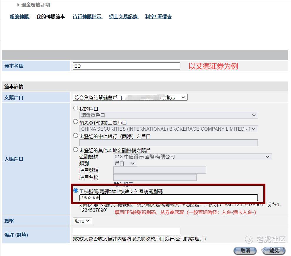入賬賬戶:建議選擇“快速支付系統識別碼”這個選項,直接填入券商的FPS ID即可(在相關券商點擊入金即可查詢)。
