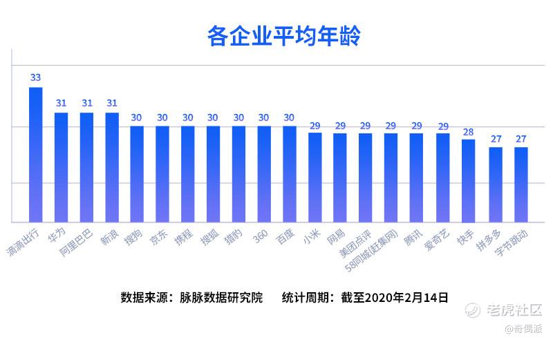 除了管理層外,阿里整體也趨向老化。在脈脈的數據統計中,阿里巴巴以平均31歲的員工高齡,僅次於滴滴出行。不談年輕的字節和拼多多,和阿里創辦時間非常接近的網易、搜狐、騰訊、新浪、京東都普遍比阿里年輕。