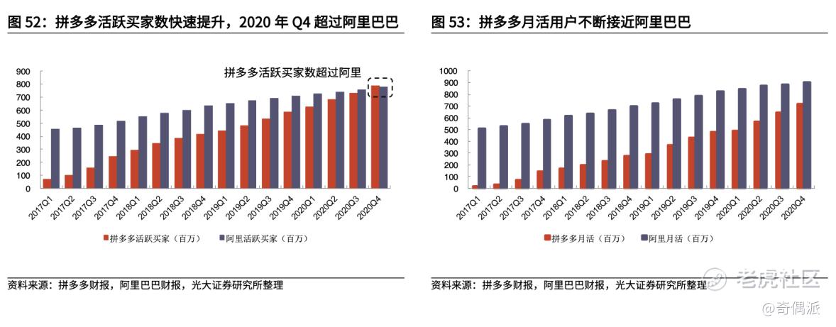 截至2020年底,拼多多年活躍買家數達7.884億,超過淘寶,成爲中國用戶規模最大的電商平臺。2月12日,日活躍用戶數爲2.59億,史上首次超過手機淘寶的2.37億。