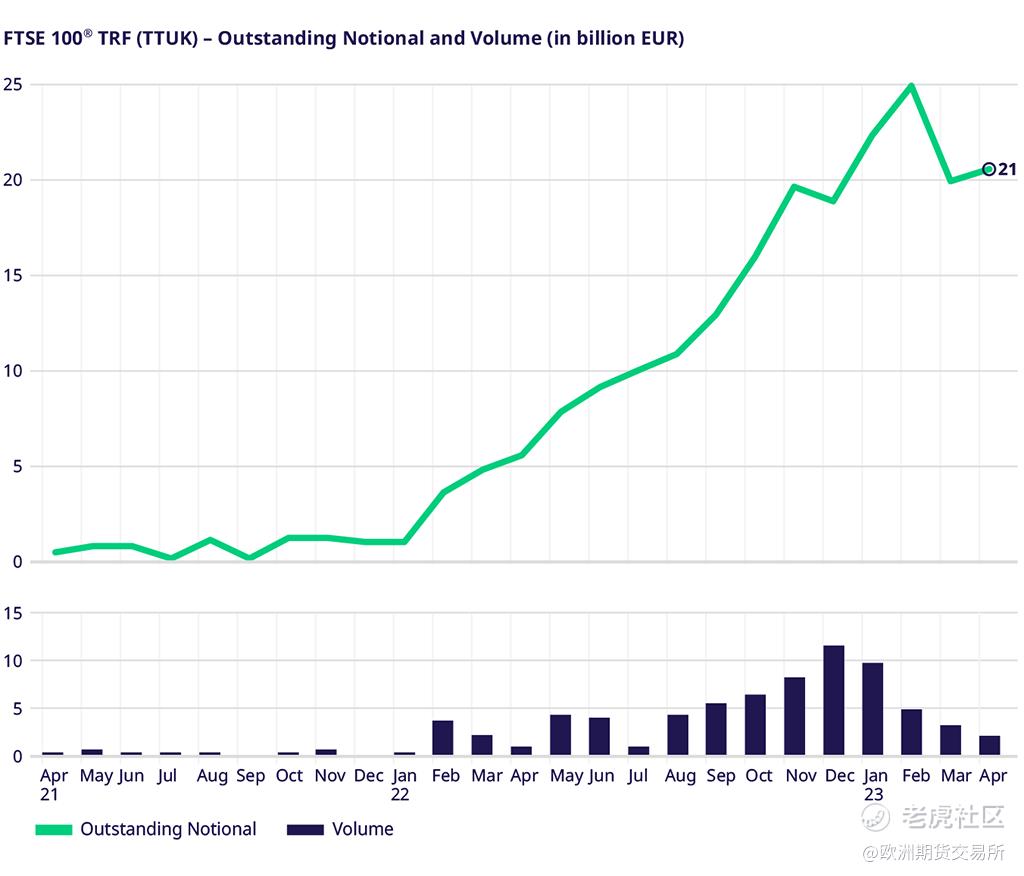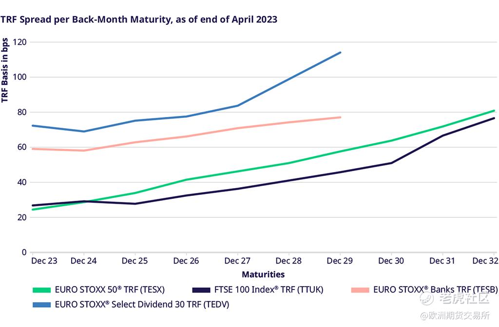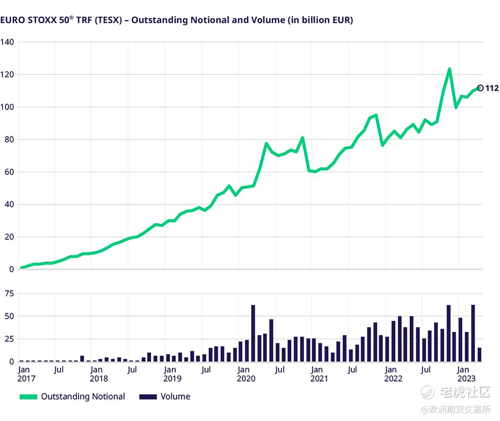 在忙碌的 3 月轉倉高峯期之後,4 月指數總回報期貨的交易量相應減少。不過,藍籌指數產品歐盟藍籌 50指數(EURO STOXX 50®) 和富時100 指數 (FTSE 100) 的未平倉合約緩慢上升,分別達到1,120億歐元和200億英鎊。在歐盟高息30指數 (EURO STOXX Select Dividend 30) 中,指數總回報期貨的未平倉合約現已超過常規的價格回報指數期貨,爲 16 億歐元。