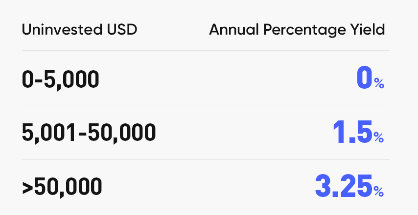 Your uninvested cash can now get you automatic interest with Tiger Trade. If you have over $5,000 in USD or AUD sitting uninvested, it's time to make that money work harder for you! Here's how our current tiered interest rates look*: