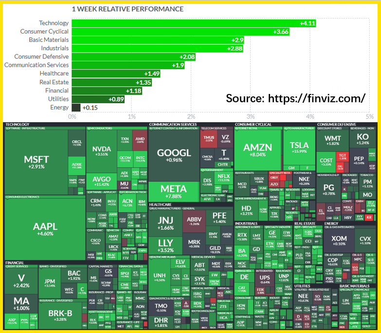 At last week, All the sectors rise. Technology sector top the performances by 4.11% with $Microsoft(MSFT)$ , $Apple(AAPL)$ , $NVIDIA Corp(NVDA)$ , $Broadcom(AVGO)$ rose 2.91%, 4.6%, 3.55%, 11.42% respectively.
