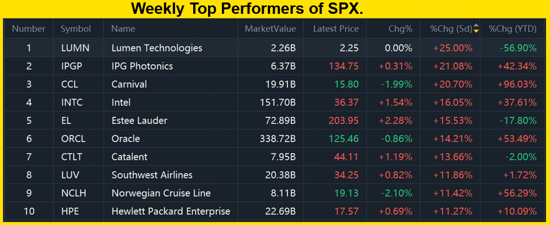 The top 10 winners of $S&P 500(.SPX)$ are $Lumen Technologies(LUMN)$ $IPG Photonics(IPGP)$ $Carnival(CCL)$ $Intel(INTC)$ $Estee Lauder(EL)$ $Oracle(ORCL)$ $Catalent(CTLT)$ $Southwest Airlines(LUV)$ $Norwegian Cruise Line(NCLH)$ $Hewlett Packard Enterprise(HPE)$