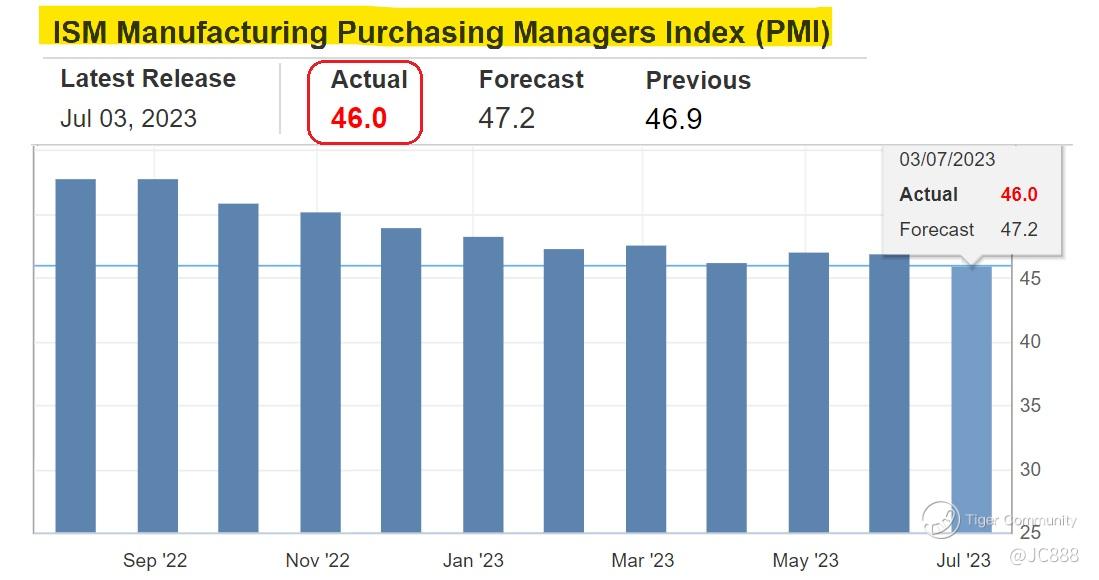 The ISM Manufacturing Purchasing Manager Index (PMI) data was the first to be released on Mon, 03 Jul 2023, (see above):