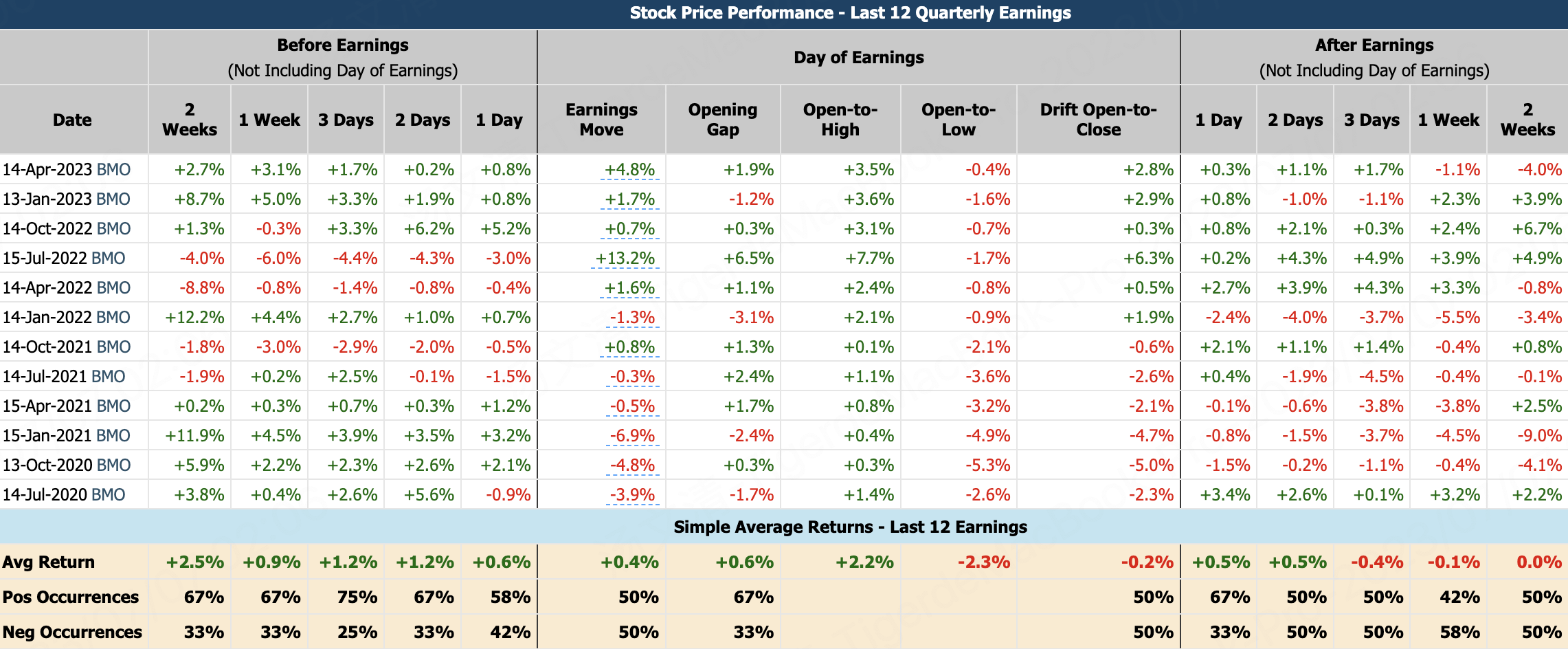 As you can see from the table below, the data displays the percentage moves had for the last 12 quarters around earnings. The 3 day run up into earnings is notable as it shows that the stock increased 75% of the time for an average gain of 1.2%. That was actually a better bullish play than holding JPM through earnings that saw a -0.8% decline.
